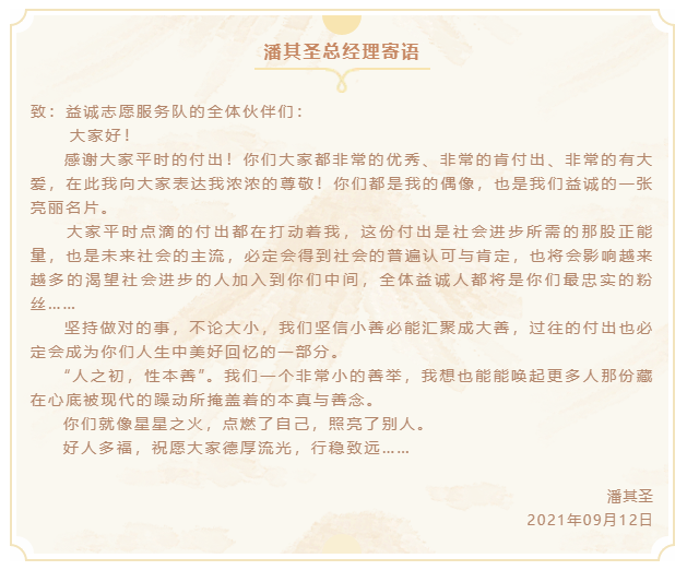 本次團(tuán)建活動(dòng)結(jié)束后,潘其圣總經(jīng)理特寄語(yǔ)全體志愿者伙伴,勉勵(lì)大家德厚流光,行穩(wěn)致遠(yuǎn):